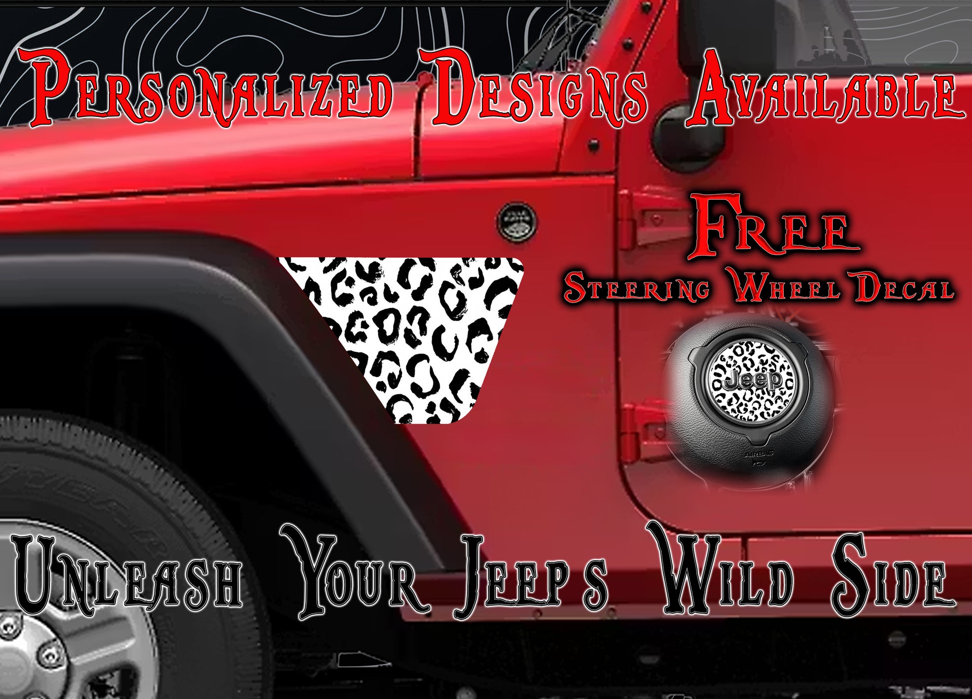 Add some fierce style to your Jeep with these playful Black and White Leopard Print JK fender decals, perfectly made for models from 2007 to 2018. These eye-catching decals bring a bold and wild touch to your ride, letting your adventurous spirit roar on every trail. Easy to stick on and built to last, they’re the perfect way to unleash your Jeep’s wild side with a fun twist!