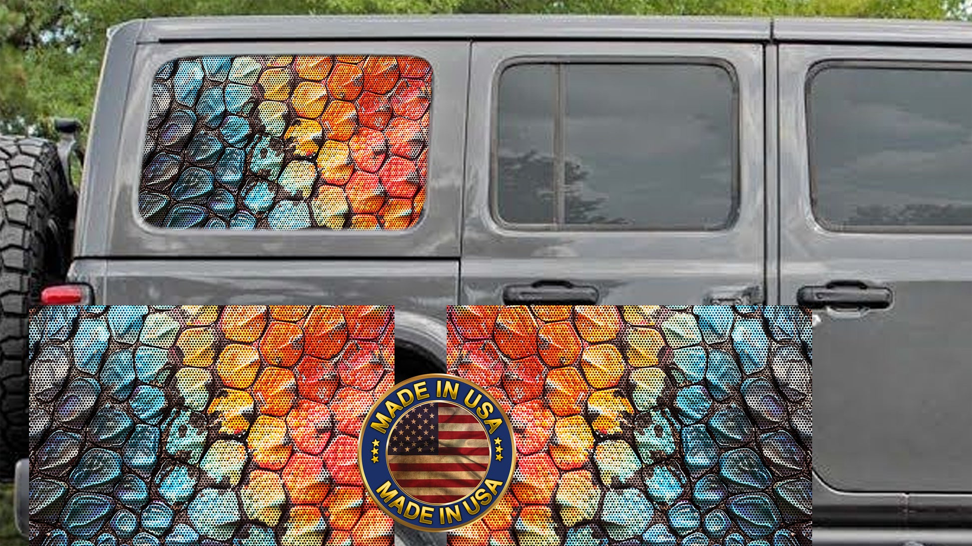 Want your ride to stand out? Let us create a custom window wrap for you! Make your car one-of-a-kind with our rear quarter window see-through graphic.