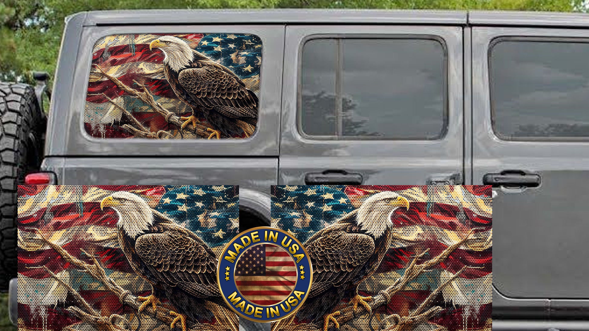Show your patriotic spirit with the Eagle with the Flag rear quarter window see-through graphic. This playful design features a soaring eagle wrapped in the flag, letting light through while making a bold statement. Easy to apply and sure to stand out, it’s a fun way to celebrate your pride on the road.