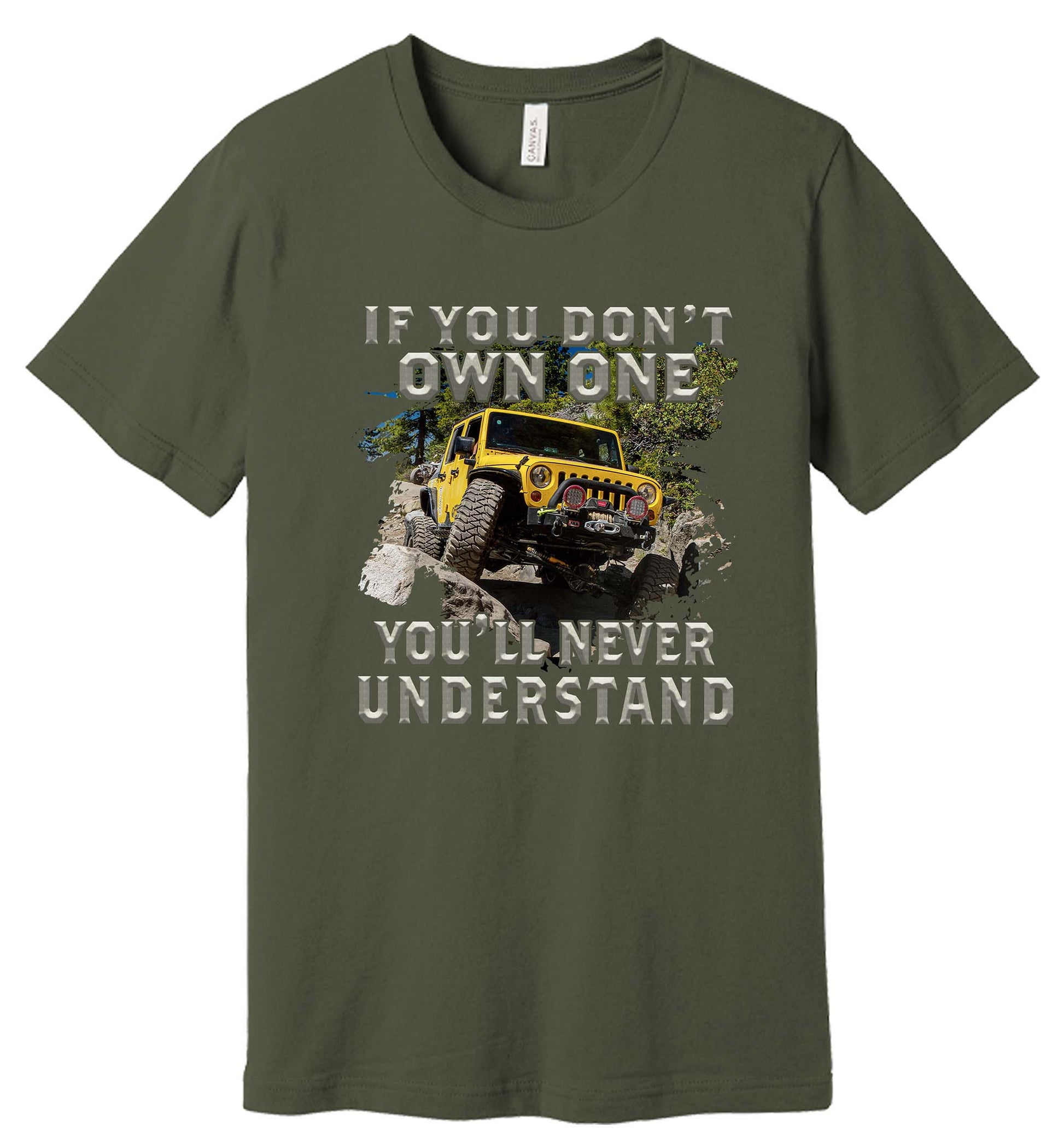 Calling all off-road enthusiasts! This striking t-shirt features a bold design showcasing a yellow conquering rugged terrain, accompanied by the statement 'If You Don't Own One You'll Never Understand.' Perfect for off roaders and rock crawling aficionados, this shirt celebrates the unique thrill of off-road adventures. The high-quality graphic print displays impressive detail, from the custom-lifted car to the natural backdrop of trees and rocky obstacles. Made with comfort in mind, this casual crew neck t-shirt is ideal for showing off your passion for off-roading whether you're hitting the trails or hanging out with fellow enthusiasts. The classic fit and durable construction ensure this t-shirt will be a long-lasting addition to your wardrobe.