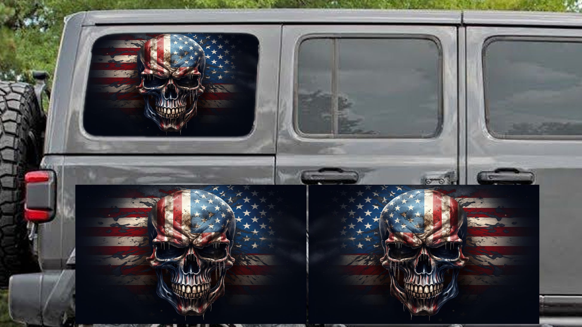 Add a bold and playful touch to your ride with this Skull with Flag rear quarter window see-through graphic. Designed to let light in while showcasing a striking skull and flag design, it’s perfect for those who want to stand out on the road without sacrificing visibility. Easy to apply and durable, this graphic brings attitude and style to your vehicle’s look.