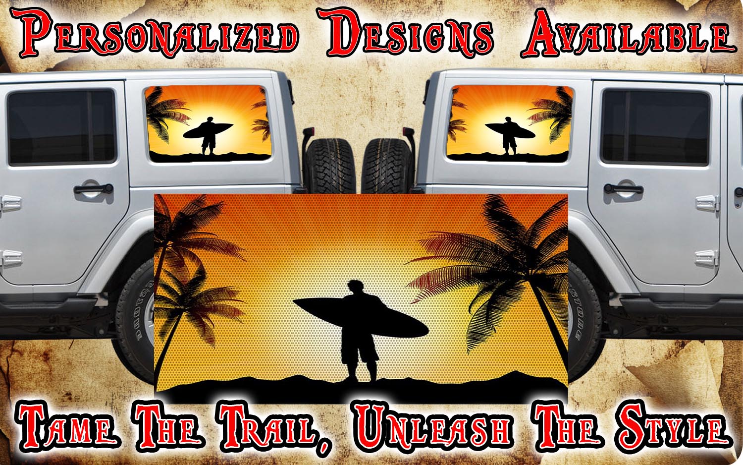 Hang ten with this dynamic surfing rear quarter window graphic that brings action and adventure to your vehicle. This see-through decal features a surfer in motion, letting your car's interior shine through while showcasing your passion for the waves. Built tough to handle sun, salt, and road conditions without fading. Whether you're a seasoned shredder or just love the surf lifestyle, this eye-catching design turns every commute into a celebration of the sport you love.